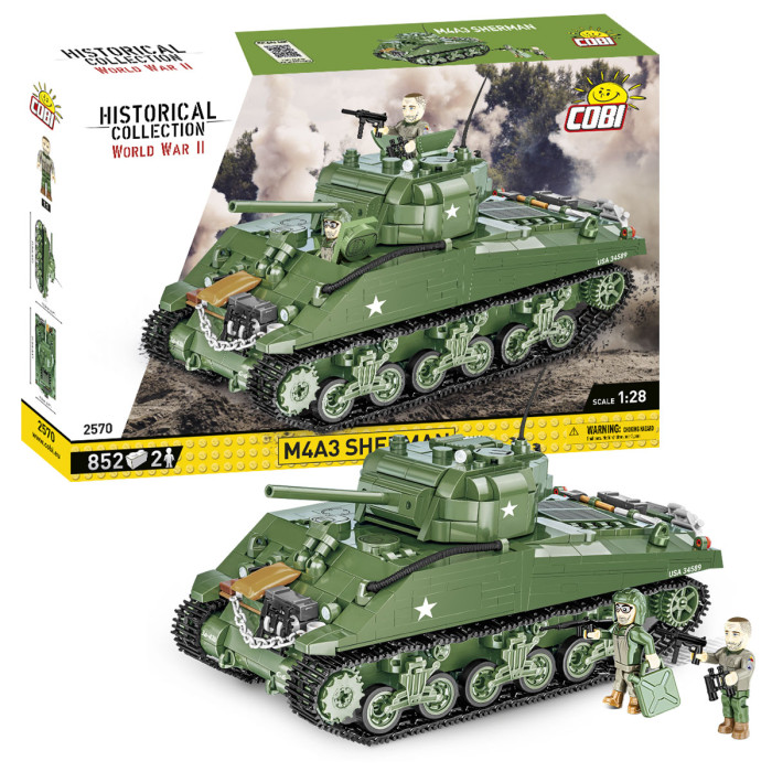 Den COBI-byggekloss baserte Sherman ble produsert i stor skala 1:28, noe som gjør at flere detaljer kan reproduseres! Tanken har en bevegelig kanon, et roterende tårn, en åpningsluke og et fungerende sporsystem. Alle grafiske detaljer er utskrifter av høy kvalitet som ikke slites av selv under intens lek. Fordelen er designet som unikt gjenspeiler de originale formene til dens historiske inspirasjon. Det er ekstra tilbehør på tanken som gjenskaper kjøretøyets og kan brukes av minifigurer som representerer tankens mannskap. Spesielt bemerkelsesverdig er den perfekt gjengitte figuren til tanksjefen, der du kan se en helt som er verdig de beste krigsfilmene. Hele settet kompletteres av en plate med navnet på tanken trykt på.