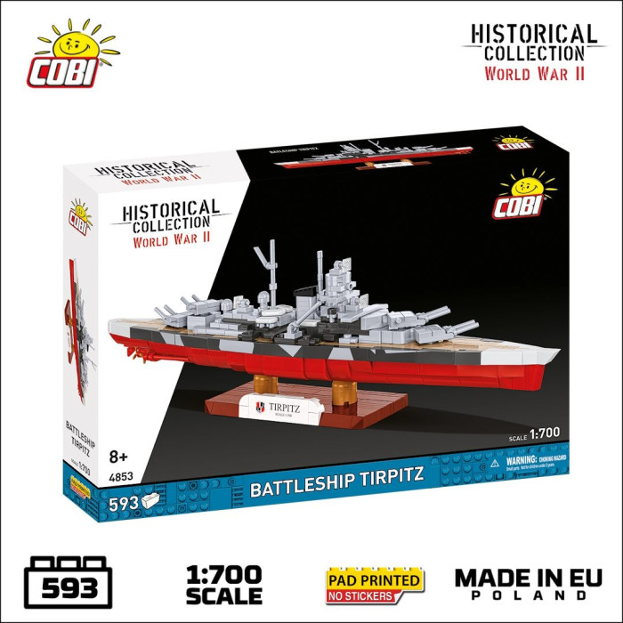 Slagskipet Tirpitz fra Cobi med 600 deler er ett av våre mest etterspurte byggesett. Dette historisk nøyaktige byggesett modellen fra COBI er trofast gjengitt slik det originale skipet fremsto. Det reflekterer nøyaktig proporsjonene til et historisk skip og bevarer alle dets essensielle elementer, inkludert den opprinnelige kamuflasjen. Skipet har mange bevegelige deler.