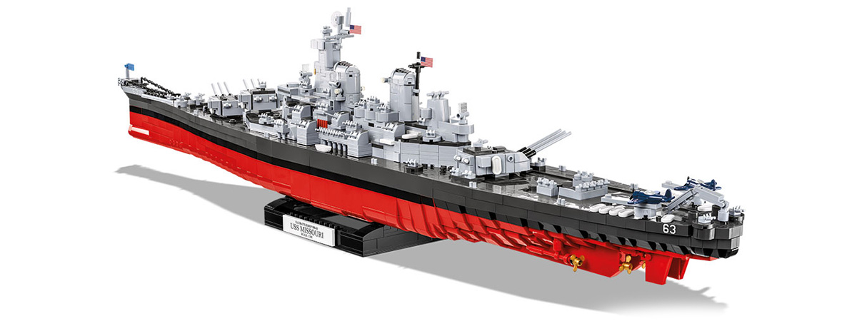 En modell laget av COBI-byggeklosser i skala 1:300 er en reell utfordring for alle byggherrer. Den består av 2655 elementer og krever flere timer med intens og spennende montering. Den er nøyaktig 92 cm (36,2 ") lang og 20,5 cm (8") høy. Den har bevegelige elementer som artilleritårn og pistolløp, propeller og et ror. Høykvalitetstrykk gjør det mulig å fange enda flere detaljer som får byggekloss skipet til å se veldig attraktivt ut! Takket være de intuitive instruksjonene basert på detaljerte illustrasjoner er konstruksjonen enkel og forårsaker ingen problemer. Settet inkluderer et spesielt utstillingsstativ med navnet på skipet trykt på platen. Skipet ser veldig imponerende ut på det, ingen vil være uimponert! Den legendariske USS Missouri vil være en unik dekorasjon av hver samling av historie, maritime fartøyer og militærentusiaster. Bygg historie, bit for bit, med COBI.
